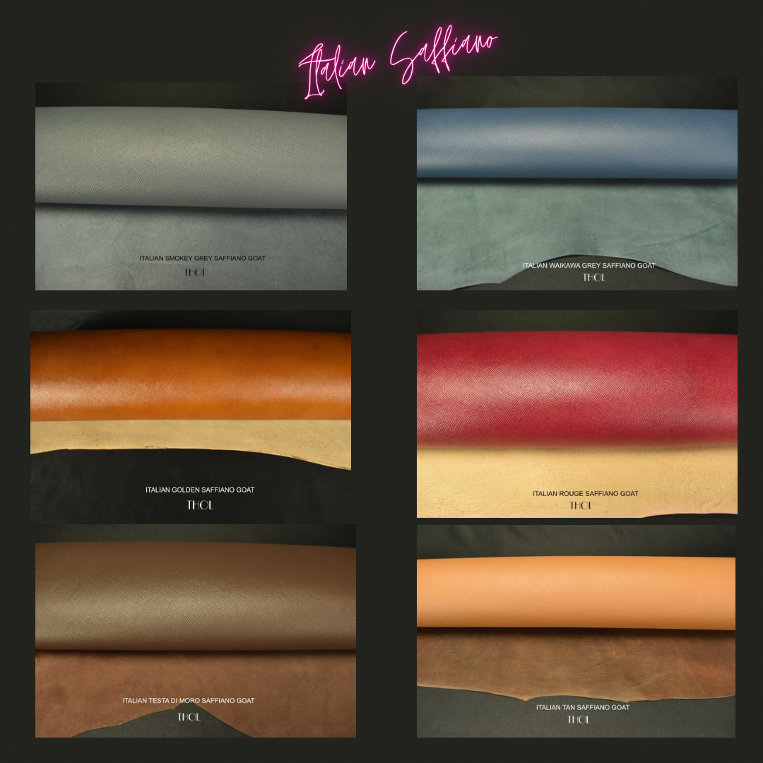 THOL’s Premium Italian Saffiano Goat is a Full Grain Italian Leather made in Tuscany come in six beautiful base colors, Golden, Testa di Moro , Black, Smokey Grey, Waikawa Grey, and Rouge. Metal Free crust leather, embossed with luxurious Saffiano cross-hatch pattern and then finish for a premium feel. This leather was created specifically for luxury leather work for creations like wallets, key chains, pouches, etc. Use suitable reinforcements like Salpa / Salamander or others, as required, to stiffen the medium firm temper option.